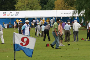 曇天を吹き飛ばす 地域一帯のパワー 9月20日の敬老の日、朝から雨で天候が心配されるなか第10回目となる恒例のグランドゴルフ大会が挙行されました。参加者の祈りが通じたのか、開会に合わせるように雨も上がり、スタートとともに北部公園のグランド一杯に歓声が沸いて和やかにプレイが進行。優勝はナント44という驚異的なスコアを出した夕日寺校下の安原さんでした。 |