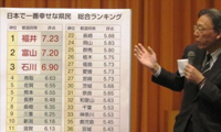 法政大学大学院が発表した幸せ度ランキングで、福井・富山に続き石川県が3位にランクされたことを受け、より良い郷土づくりのため、独自の幸福度指数を造ろうと提言。県は“ふるさと希望指数”の策定を検討しています。 |