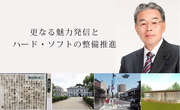 県議会六月定例会一般質問で登壇した米沢賢司は、 県内移転の方針が決まった東京国立近代美術館工芸館について、兼六園周辺文化の森にある旧陸軍の第九師団司令部や偕行社の利活用についての見解や、移転する工芸館を藩政期から現代に至る我国の工芸は、一堂に鑑賞できる拠点として発信するよう提案を行いました。 また、新幹線開業効果で賑わっている本県での更なる誘客促進策や、東北新幹線との相互乗り入れについての提案とともに本県人口の自然減対策をなす少子化対策についても、企業におけるワークライフバランスの取組み、いしかわ婚活応援企業の認定制度の充実について提案も行いました。 また、第一回となるアジア生物文化多様性国際会議についての知事の会議にかける思いなどを問い、十四年の歳月をかけて開発したルビーロマンや八年の歳月を要したエアリーフローラ、十六年の新品種の梨加賀しずくなどと同様に、九年かけてきた米の新品種石川65号の生産拡大・販売促進策や、ブランド名も問いました。 更に国道359号東山から森山一丁目交差点までの無電柱化の事業延伸を提案。 更に、新たな金沢城の魅力向上に向け、菱櫓、五十間長屋、橋爪門が一望できるくつろぎ空間としての鶴の丸休憩所の整備方針についても提案を行いました。 |